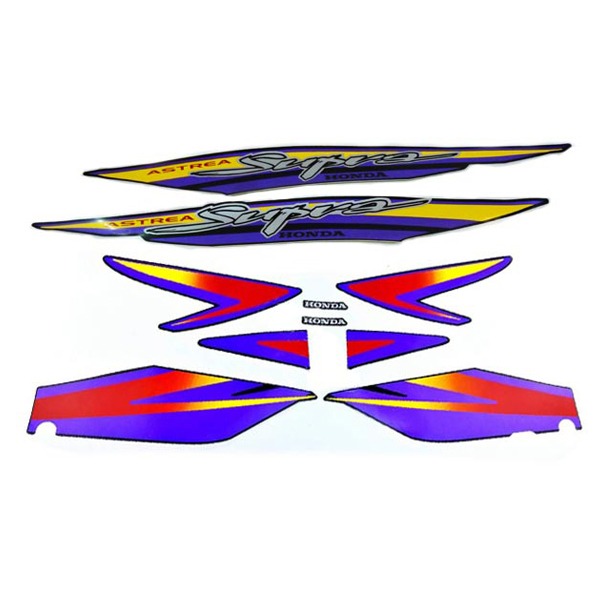 Πλήρες σετ αυτοκόλλητων Honda Supra 100, που περιλαμβάνει όλα τα αυθεντικά διακριτικά. Κατασκευασμένο με υψηλή ποιότητα και εξαιρετική προσοχή στη λεπτομέρεια, εξασφαλίζει άψογη αποτύπωση των γραφικών και αναβαθμίζει την εμφάνιση της μοτοσυκλέτας σας.