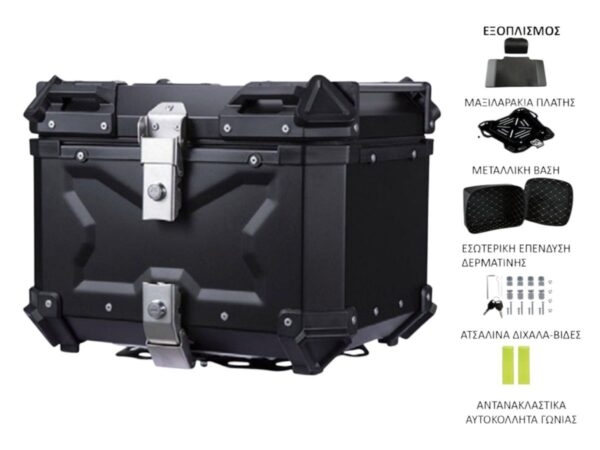 Κεντρική βαλίτσα μοτοσυκλέτας τύπου αλουμινίου ΑΝΑΧ X-STYLE 45Lt. Με ενισχυμένη μεταλλική βάση, προσφέρει εξαιρετική αντοχή στο βάρος και εσωτερική δερμάτινη επένδυση προστατεύοντας το περιεχόμενο από κραδασμούς και γρατζουνιές,